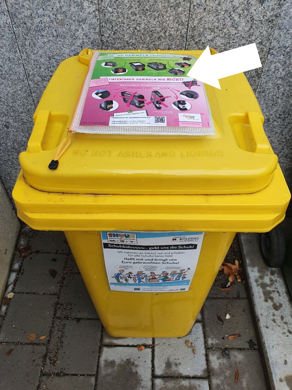 An unseren bereits bekannten Schuh-Sammeltonnen haben wir Taschen angebracht, in die die Tintenpatronen eingesteckt werden können.